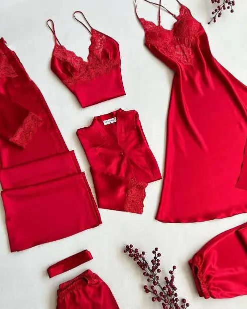 Step into a world of elegance and comfort with this stunning 5-piece nightwear set. Designed with premium silk for a soft, dreamy feel against your skin, this set combines sensuality with sophistication.